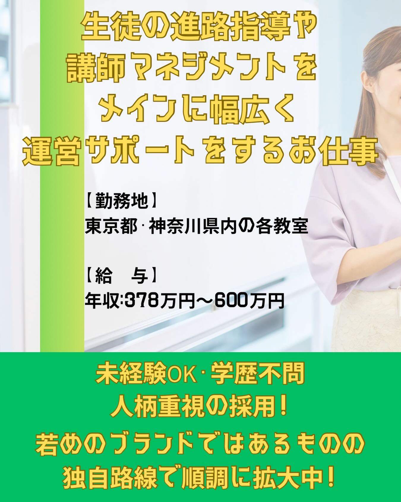 本日は【教育だけに止まらず、様々なビジネススキルも磨ける★直営+フランチャイズ校舎を含めて 全国に400校以上をFC展開し、その拡大は現在も右肩上がりの企業様】の求人をご紹介します😊